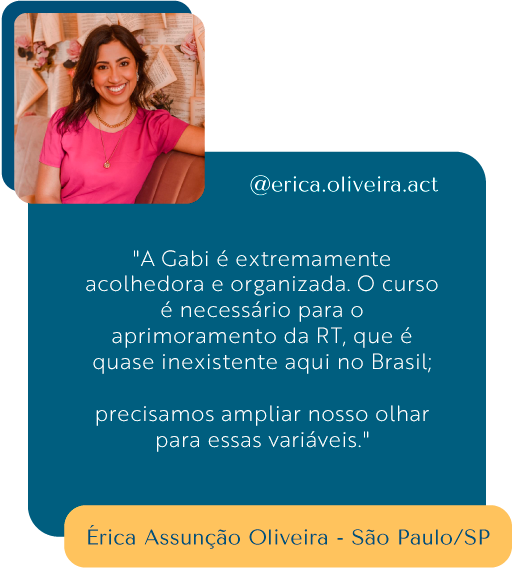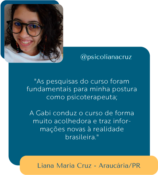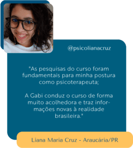 Gabi é uma psicóloga clínica graduada, especialista e mestra em clínica analítico-comportamental e Treinadora Certificada em Psicoterapia Analítica Funcional (FAP). Suas intervenções se fundamentam de modo integrativo a práticas baseadas em evidências, focando nos elementos da relação terapêutica para promover mudanças significativas.